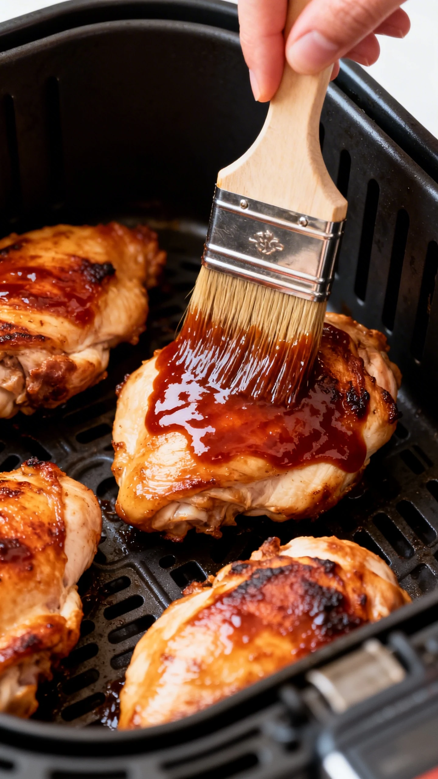 Sauce at the end for maximum stick. Brush a thin layer of sauce over the top of each thigh. Cook 2 minutes at 380°F, then brush again and cook 2 more minutes. Thin layers build a lacquer without scorching.