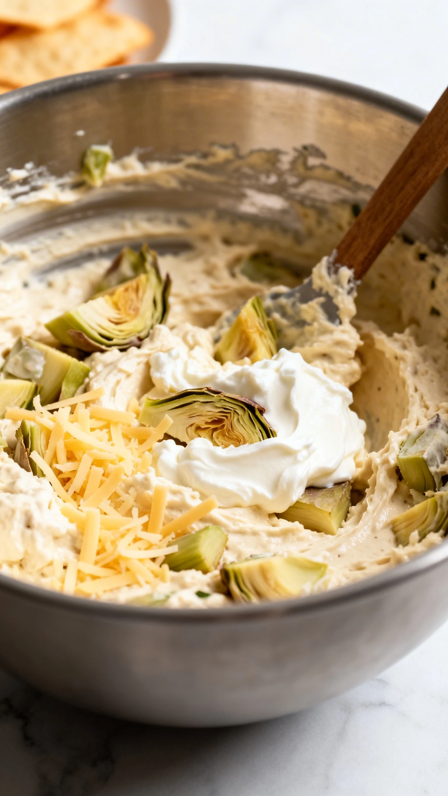 Fold in the artichokes. Add the chopped artichoke hearts and mix well. Make sure they are evenly distributed so no one gets a scoop that is just pure dairy. Delicious, sure, but let us stay balanced.