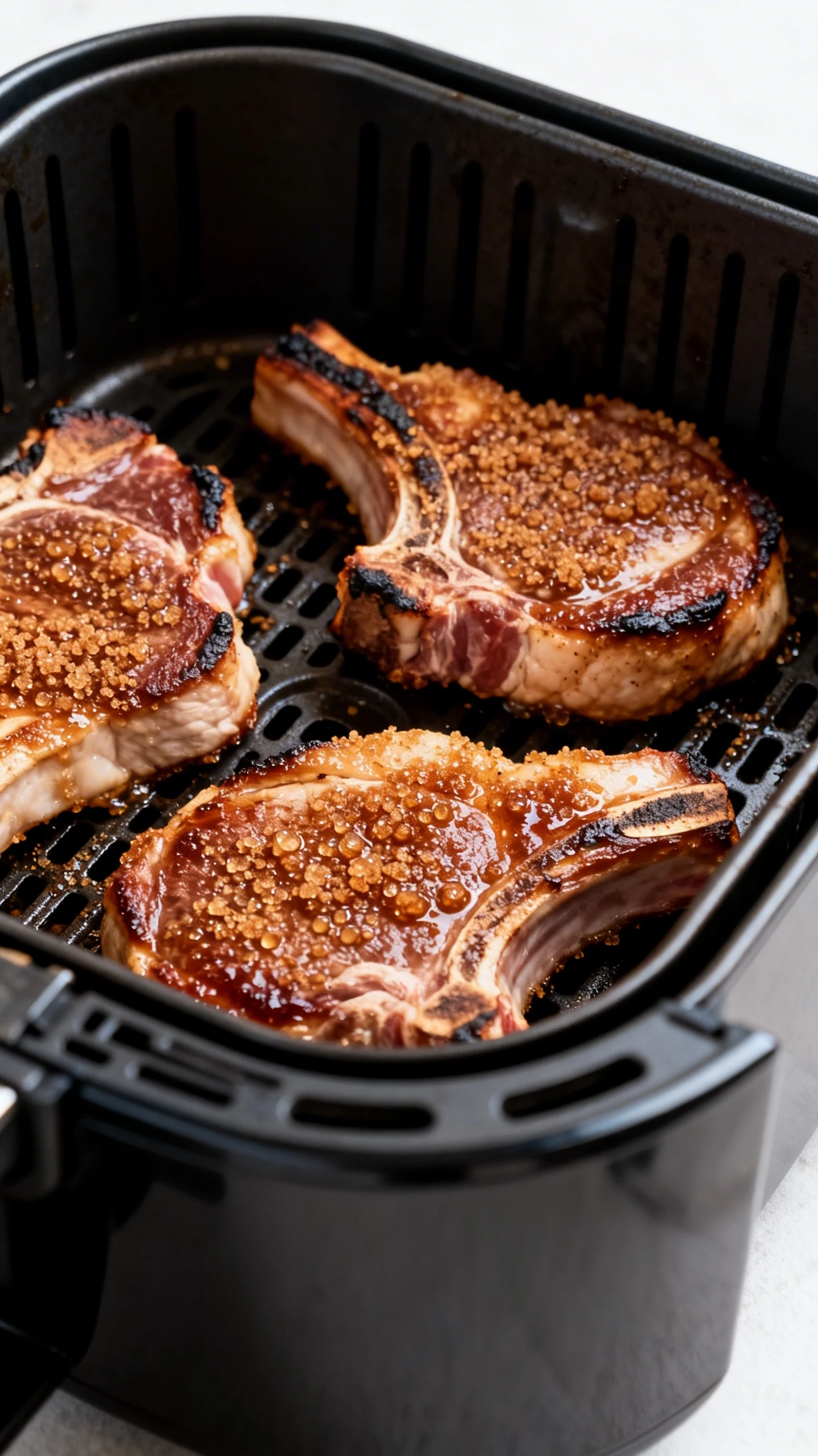 Air fry, then flip. Cook at 380°F for 6 minutes. Flip the chops carefully so you keep that sugary crust intact, then cook another 5 to 7 minutes depending on thickness.