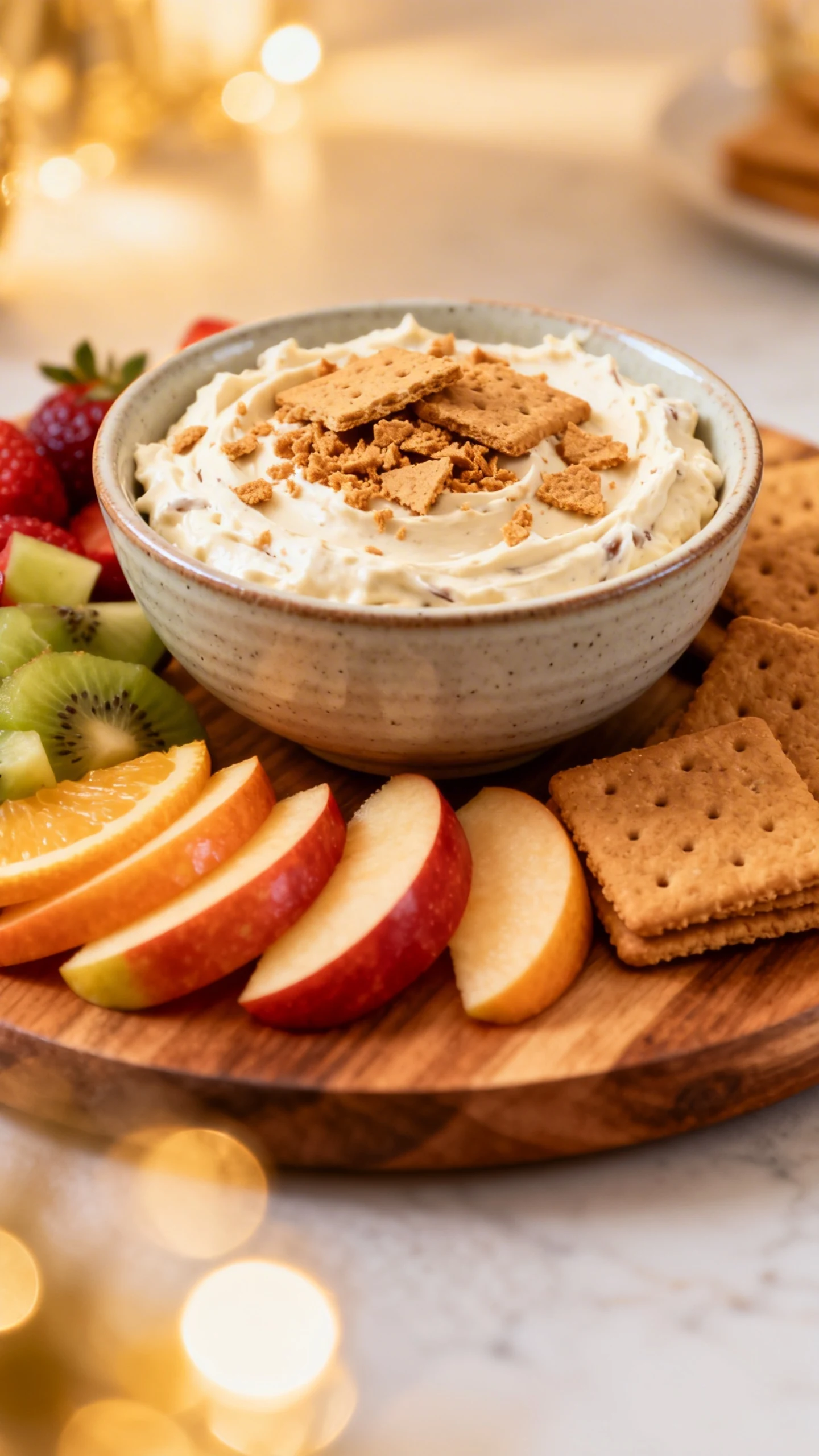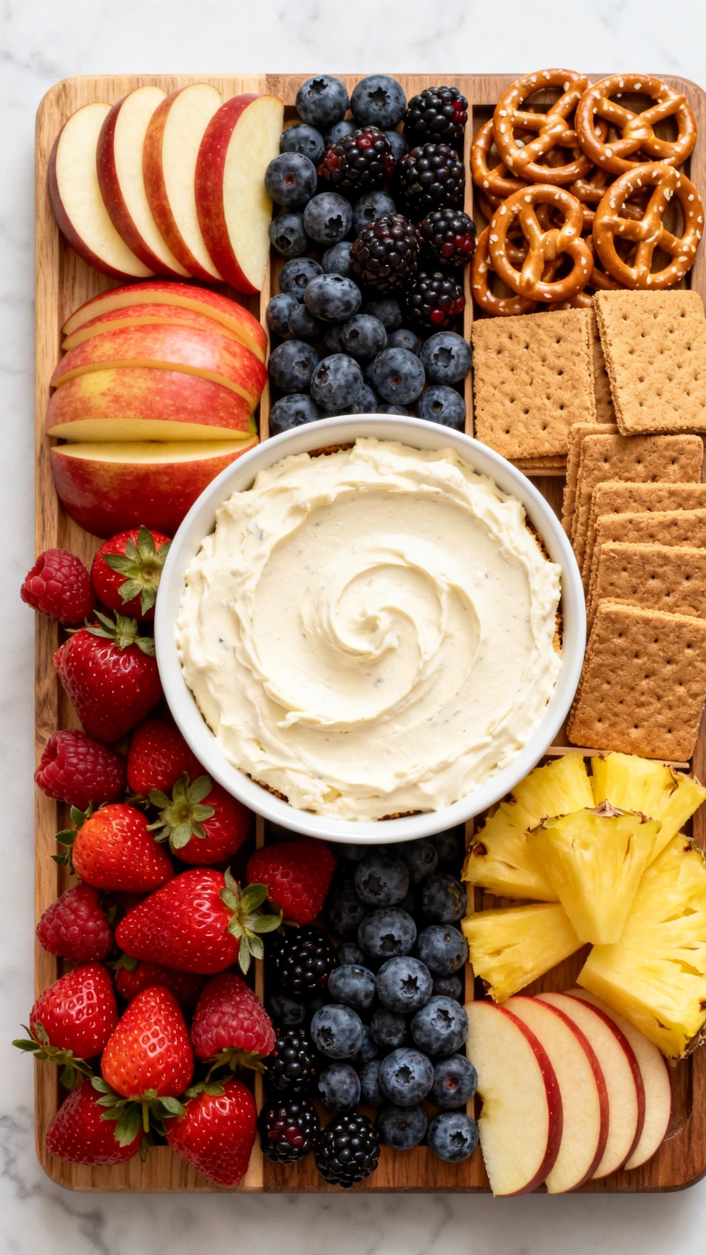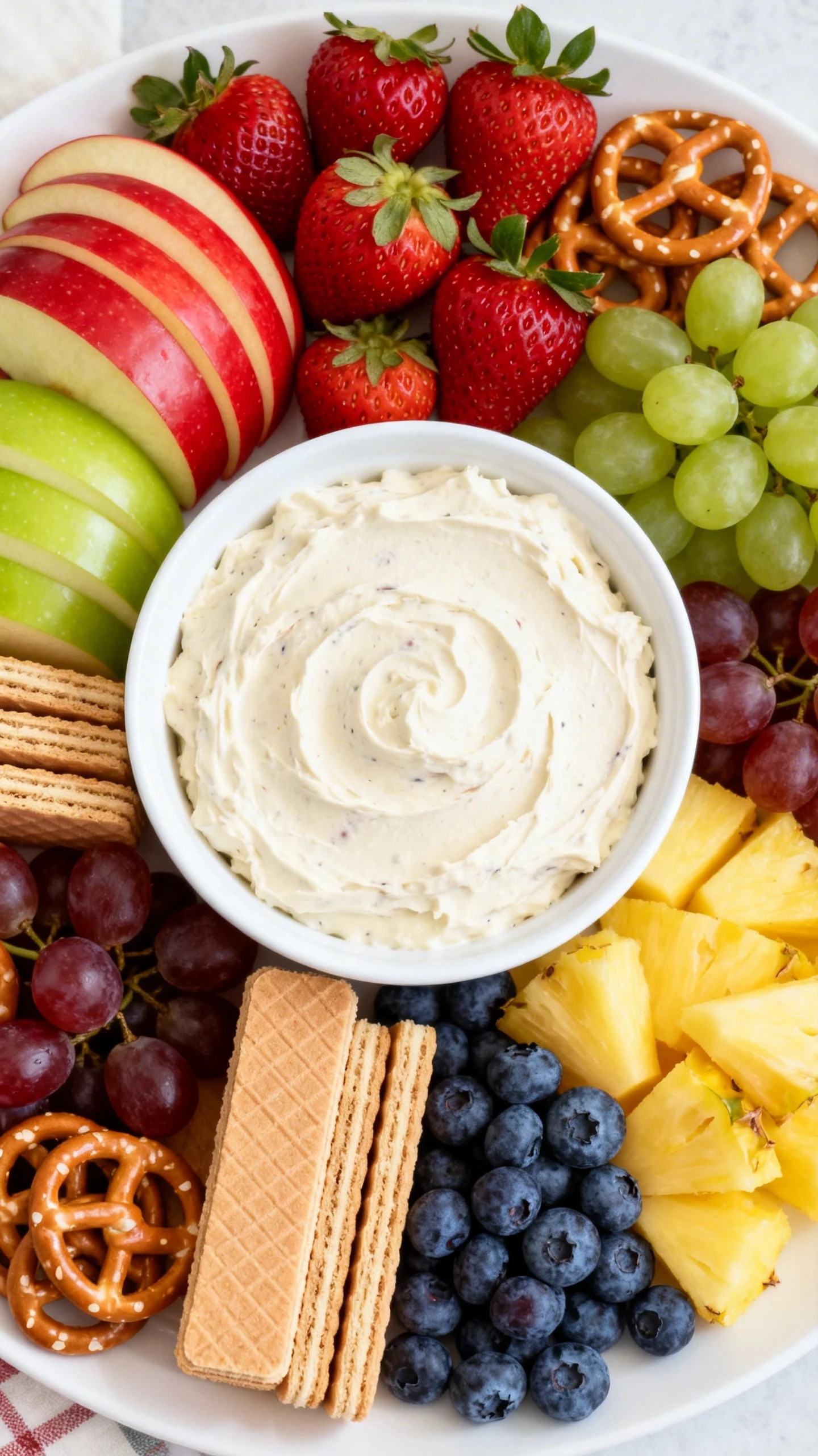 Prep your dippers. Wash and dry all fruit well. Slice apples just before serving, or toss them lightly with lemon juice to slow browning. Arrange everything around the dip on a platter so it looks intentional, even if your kitchen currently does not.