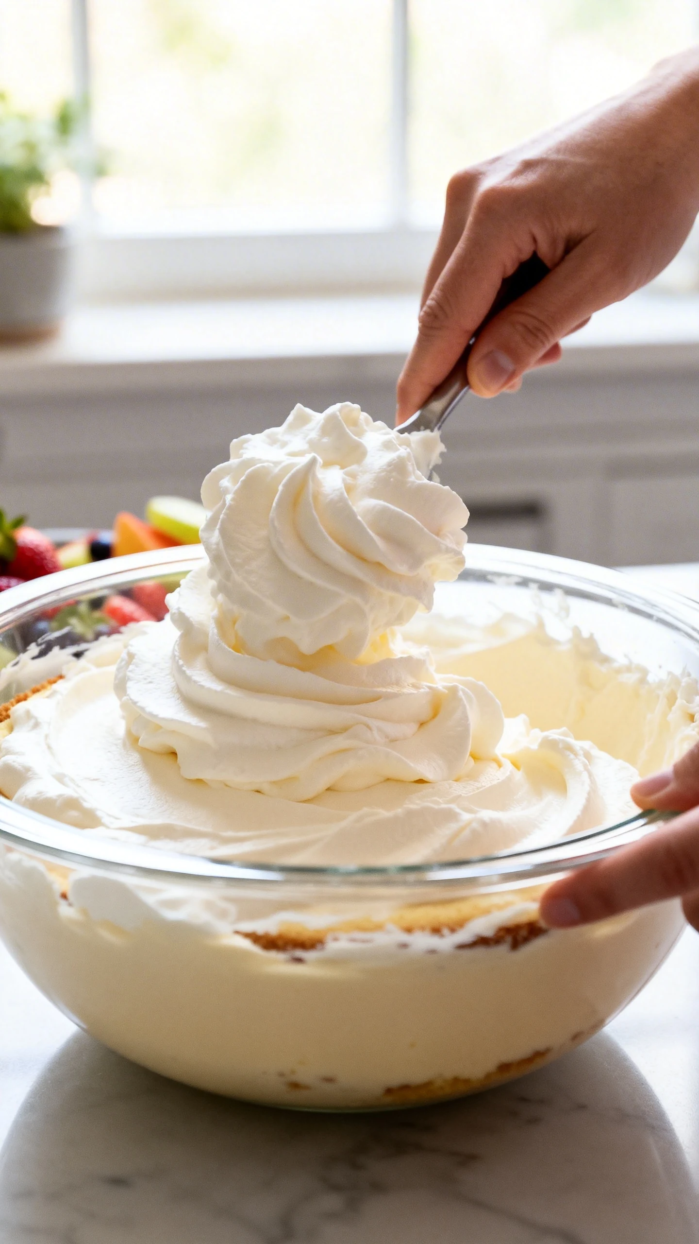 Lighten it up. Fold in the whipped topping gently until no streaks remain. Don’t beat aggressively here or you’ll knock out the air. You want soft, cloudlike texture, not a dense frosting situation.