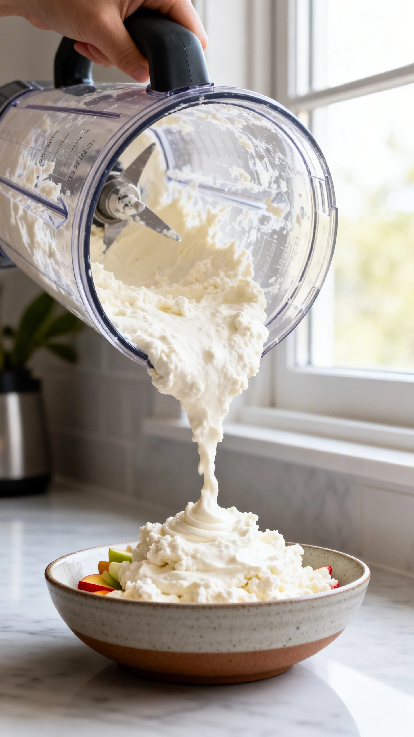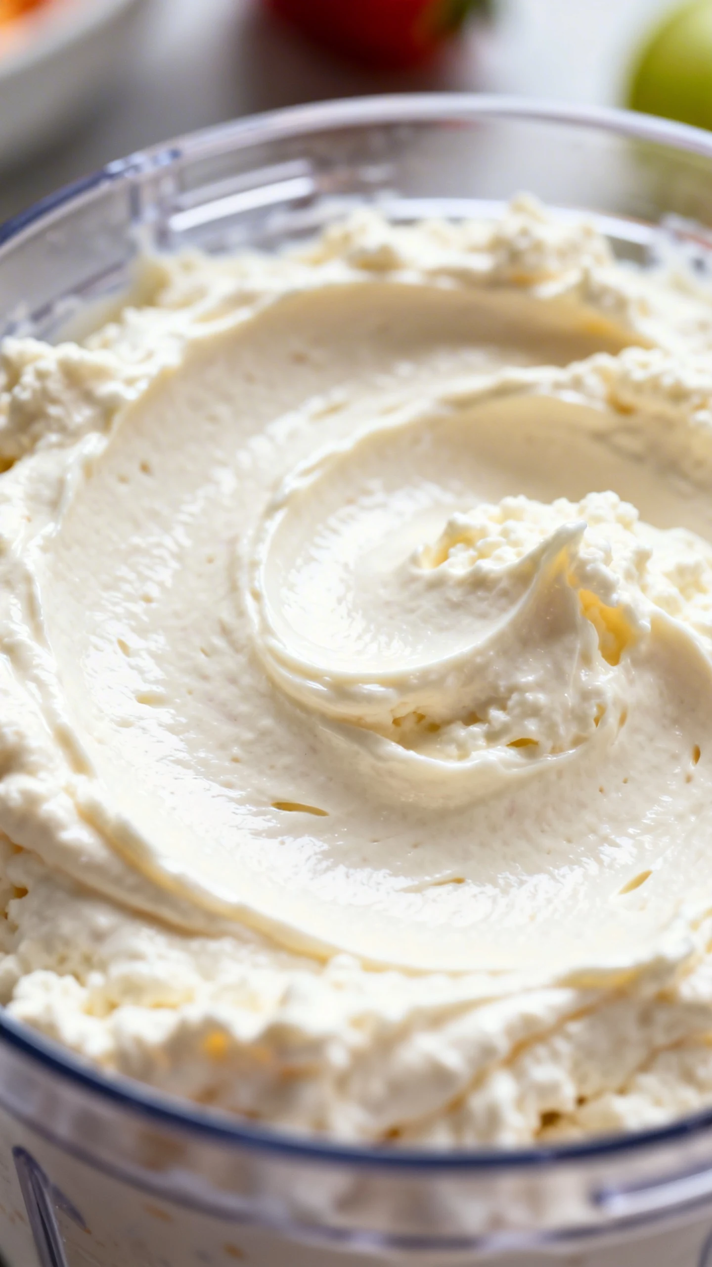 Blend until smooth. Blend for 30 seconds, scrape down the sides, then blend again until the mixture looks creamy and mostly silky. This usually takes 1 to 2 minutes depending on your machine. The goal is a soft, fluffy dip with no obvious curds staring back at you.