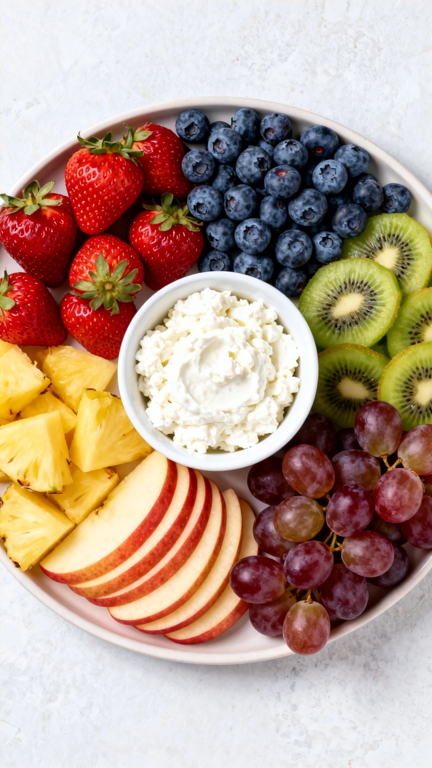 Strawberries, apple slices, grapes, pineapple, blueberries, raspberries, kiwi, and pears all pair beautifully. Bananas work too, though they brown faster after slicing. Choose a mix of crisp, juicy, and sweet fruit for the best platter.