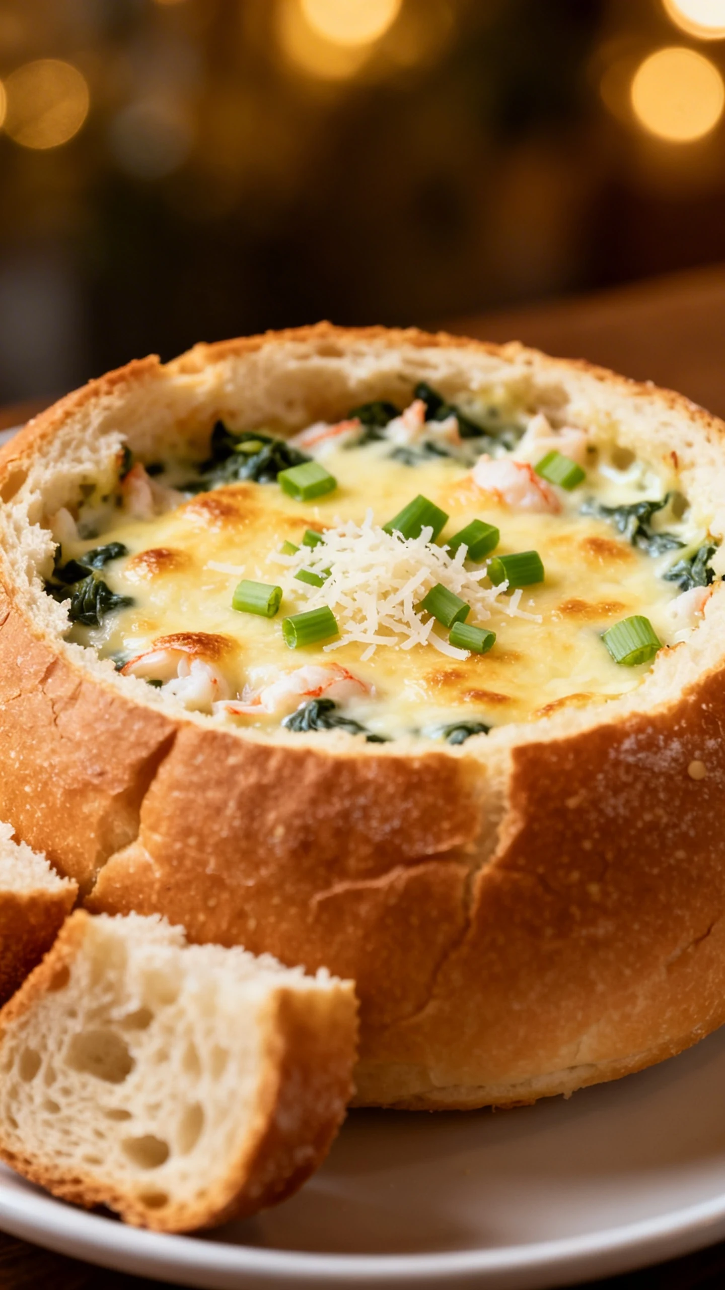 Spoon the mixture into a hollowed round loaf, top with cheese, and bake until bubbling. It looks dramatic and tastes incredible, which is basically the appetizer version of good lighting.