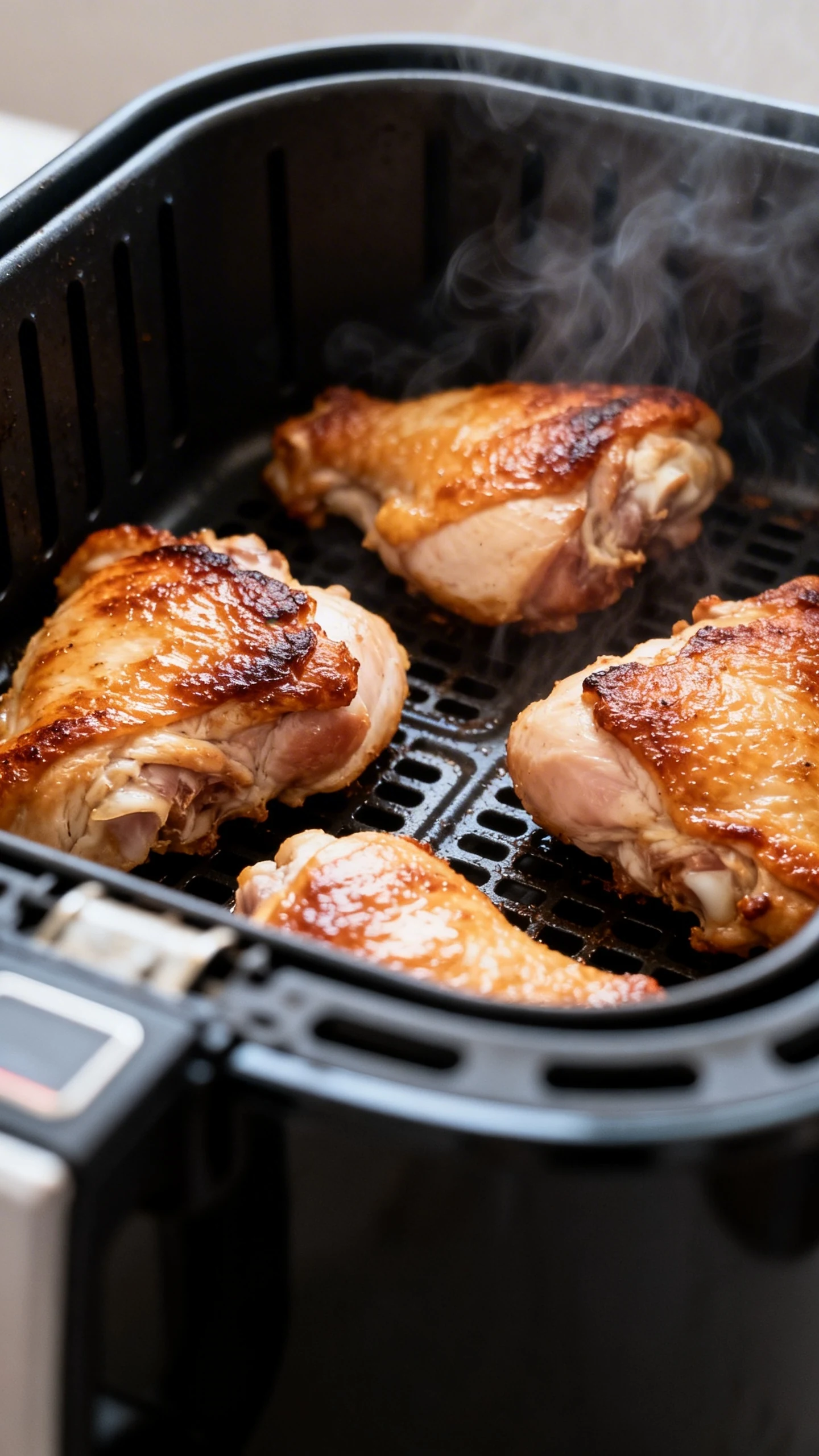 The usual culprits are moisture and crowding. Pat the thighs dry, don’t overload the basket, and make sure you finish at a higher temperature with the skin facing up. Also, some air fryers need an extra couple minutes to really brown. If the skin looks pale, give it time.