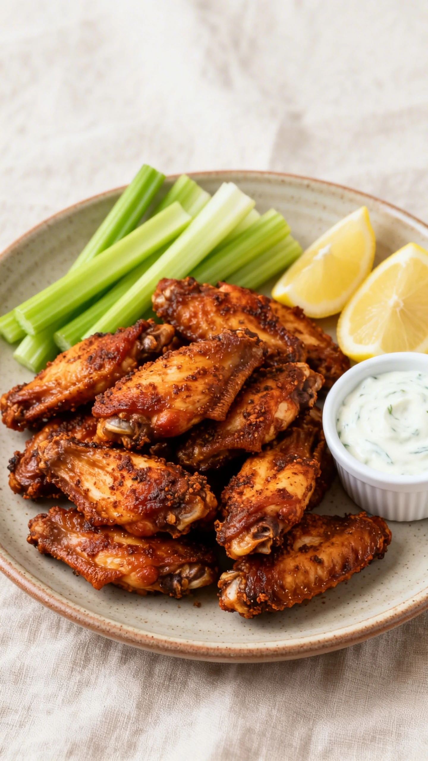 - Optional for serving: ranch or blue cheese dressing, lemon wedges, celery sticks