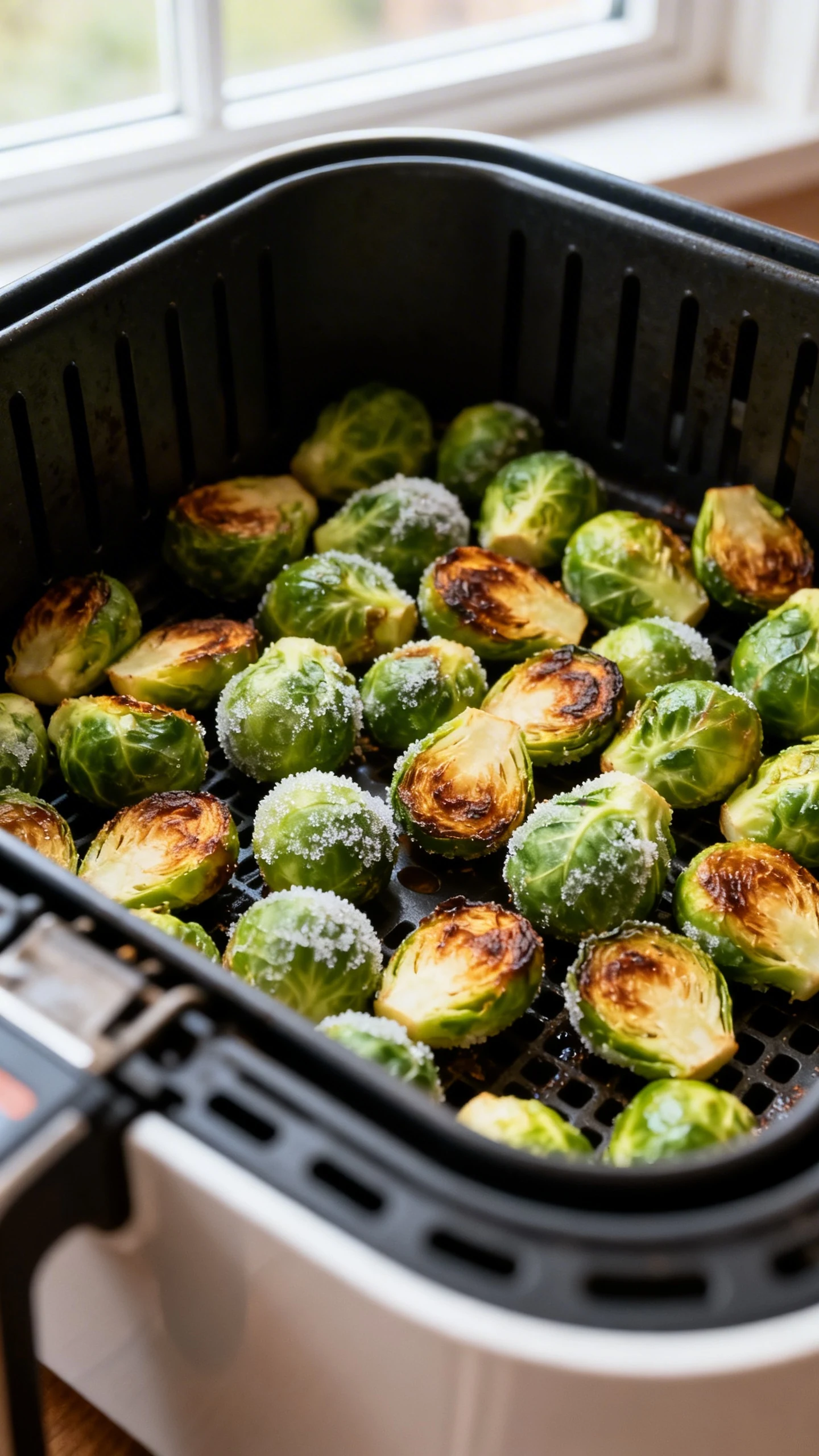 Do not overcrowd the basket. If air can’t circulate, you get steamed sprouts with sad, pale surfaces.