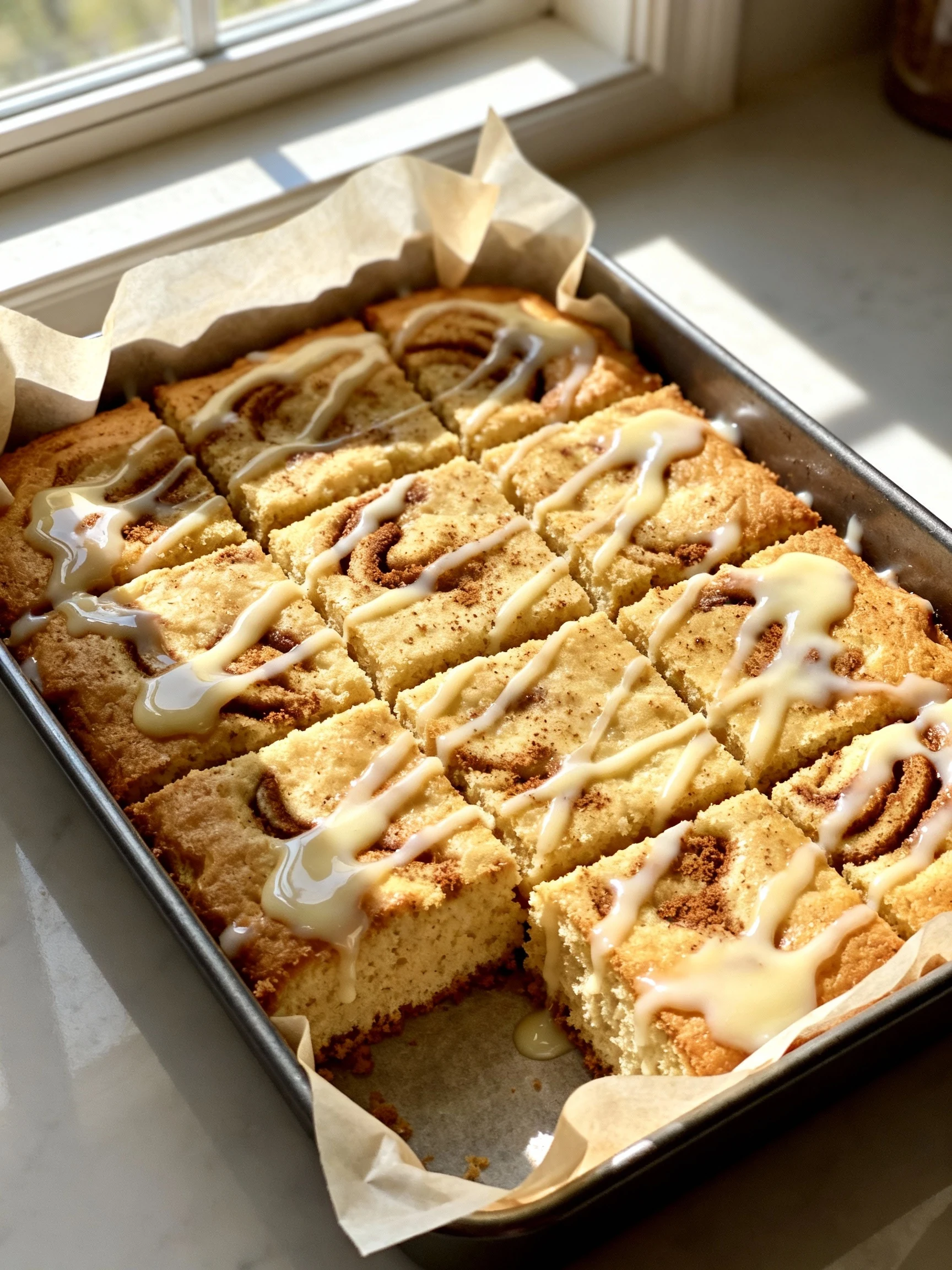 A 9×13-inch pan gives the easiest swirl-to-bite ratio and slices cleanly. A Bundt pan looks extra fancy, but grease it thoroughly so the cinnamon layer doesn’t glue itself to the ridges.