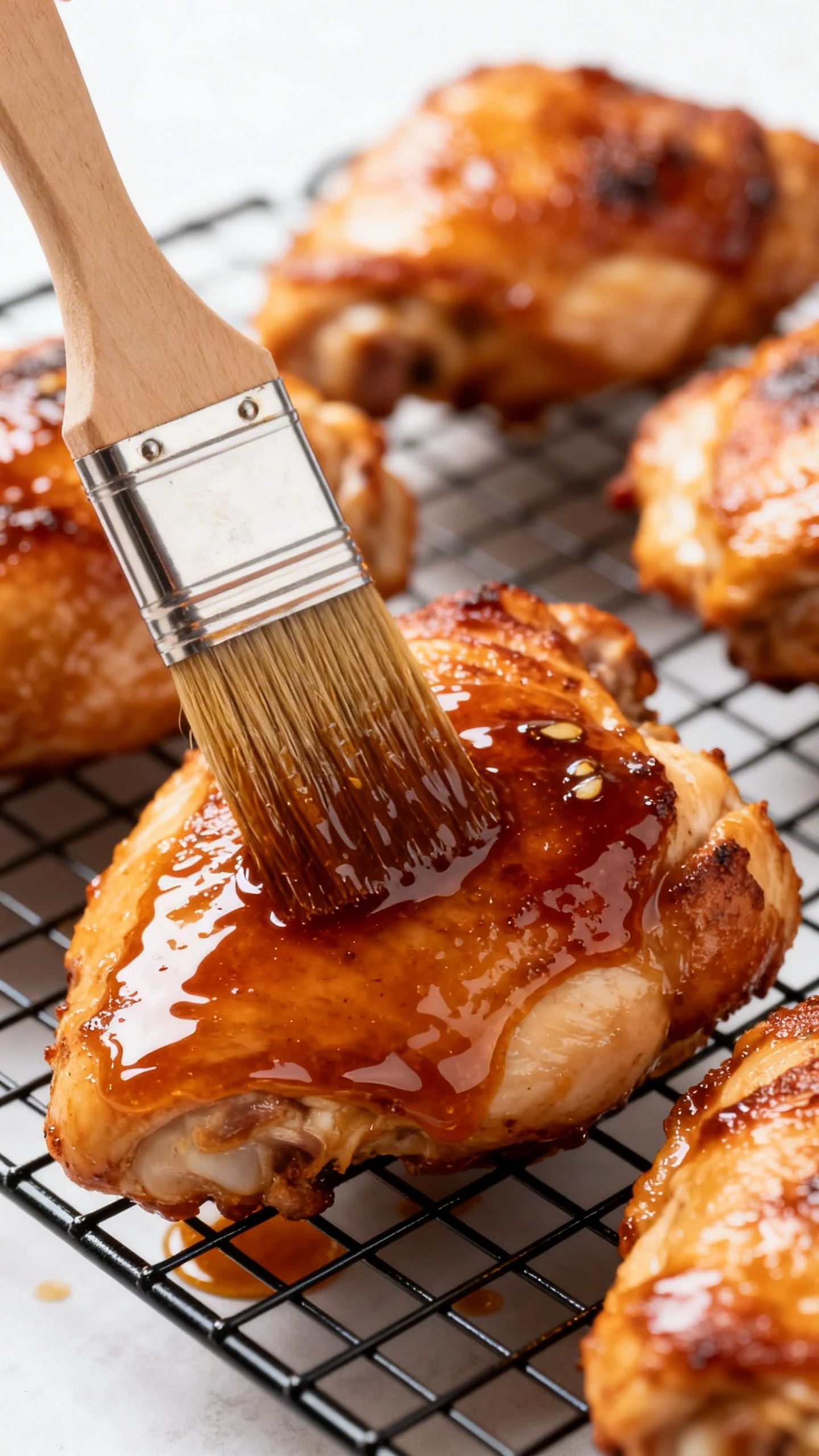 Brush on glaze near the end. When the thighs are almost done, brush a generous layer of glaze over the skin. Cook at 400°F for 2 minutes. This sets the glaze and boosts crispness.