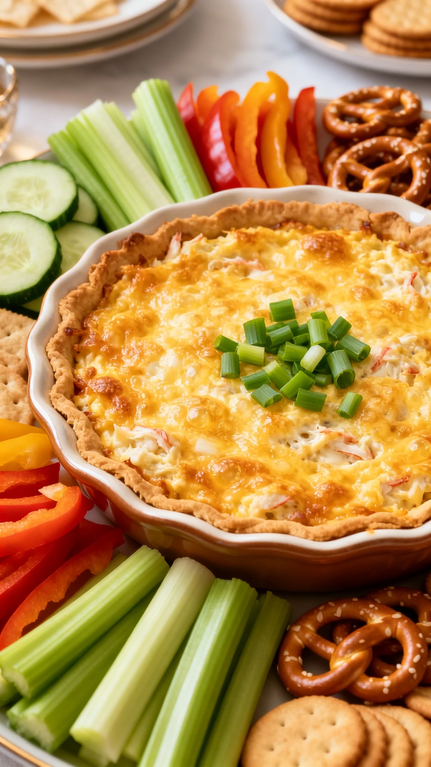 • Dippers: Crackers, toasted baguette slices, tortilla chips, celery sticks, cucumber rounds, bell pepper strips, or pretzels.