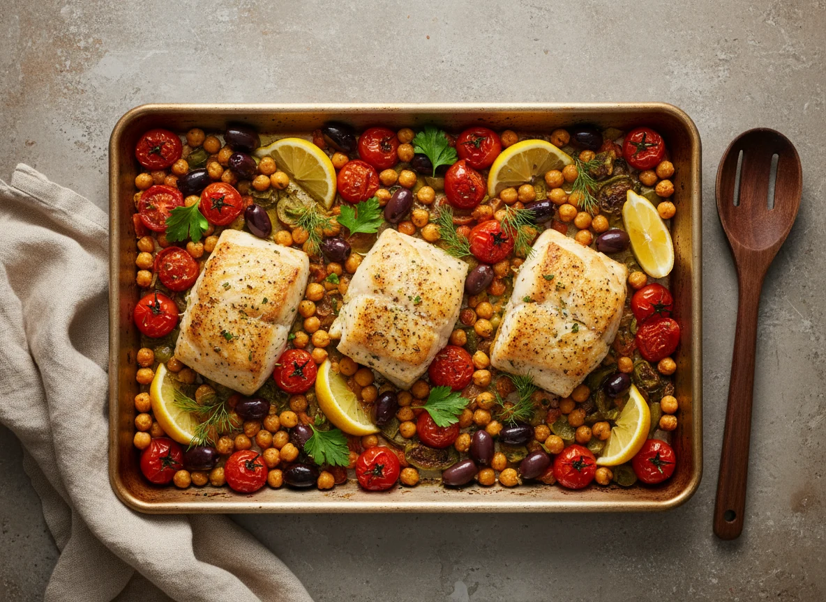 We’re building a one-pan Mediterranean baked fish with tomatoes, olives, fennel, and chickpeas. It’s bright, briny, herby, and wildly simple. Here’s why it deserves a permanent spot in your rotation: