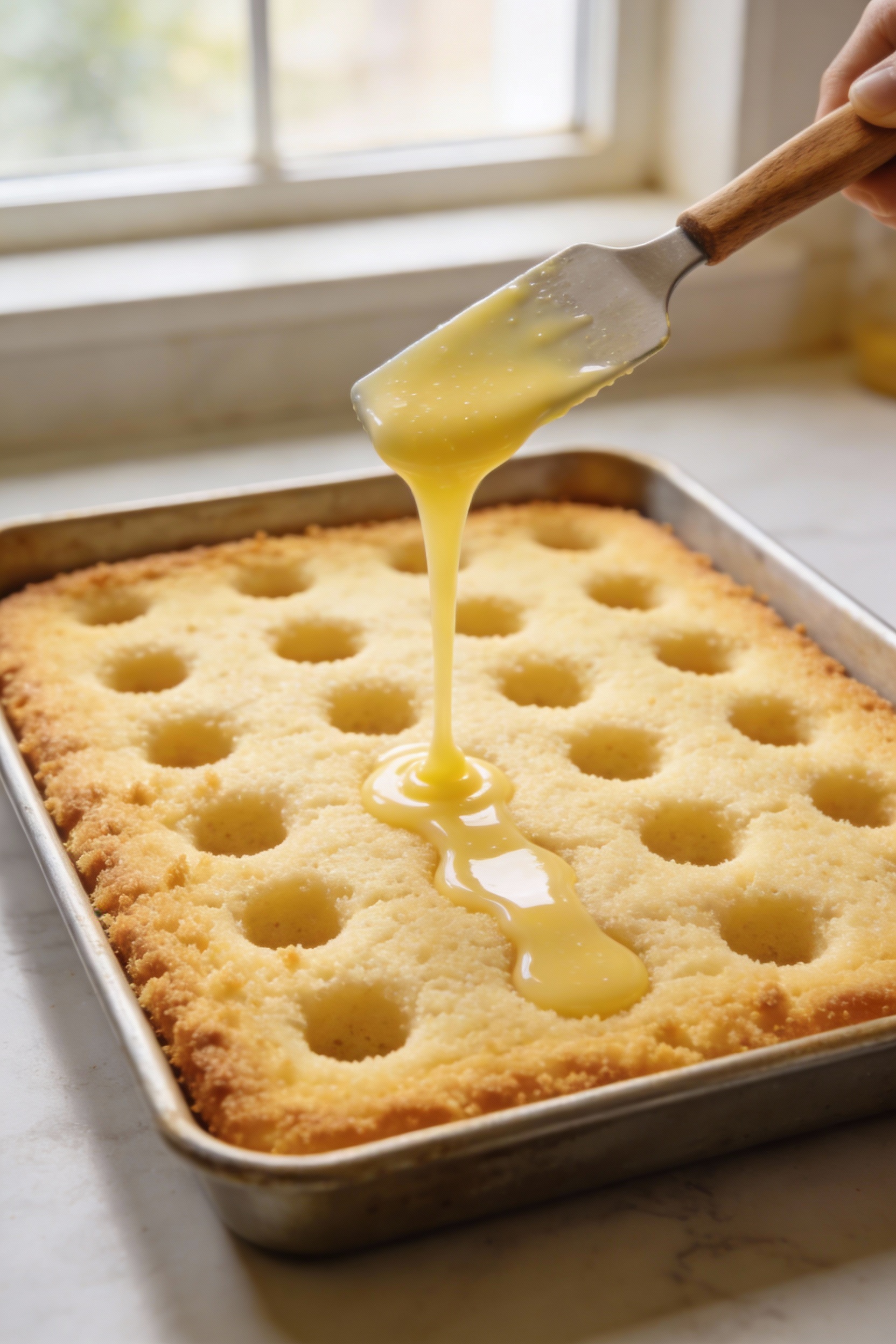 Poking too soon or too late. If the cake is screaming hot, it crumbles. If it’s fully cold, it resists soaking. Warm is the sweet spot.