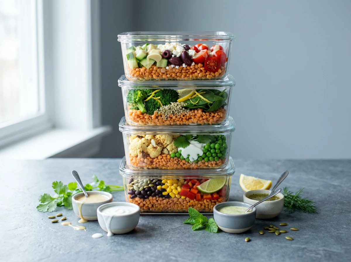 7. Assemble 4 meal prep bowls. Divide the cooked lentils evenly among four containers (about 1–1¼ cups each). Then customize: