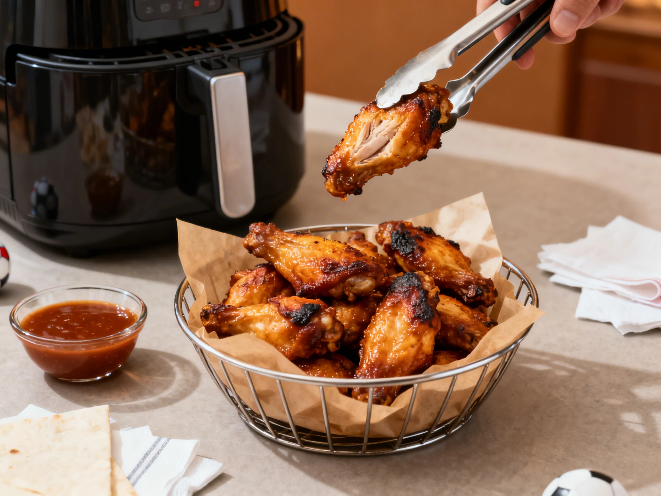 • Overcrowding the basket. If wings touch, hot air can’t circulate. Cook in batches and pretend you planned it.