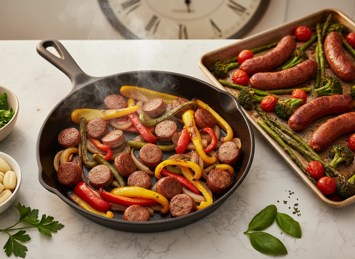 • Sheet-pan: Toss sausage + veg with oil and seasoning; roast at 425°F for 20–25 min.