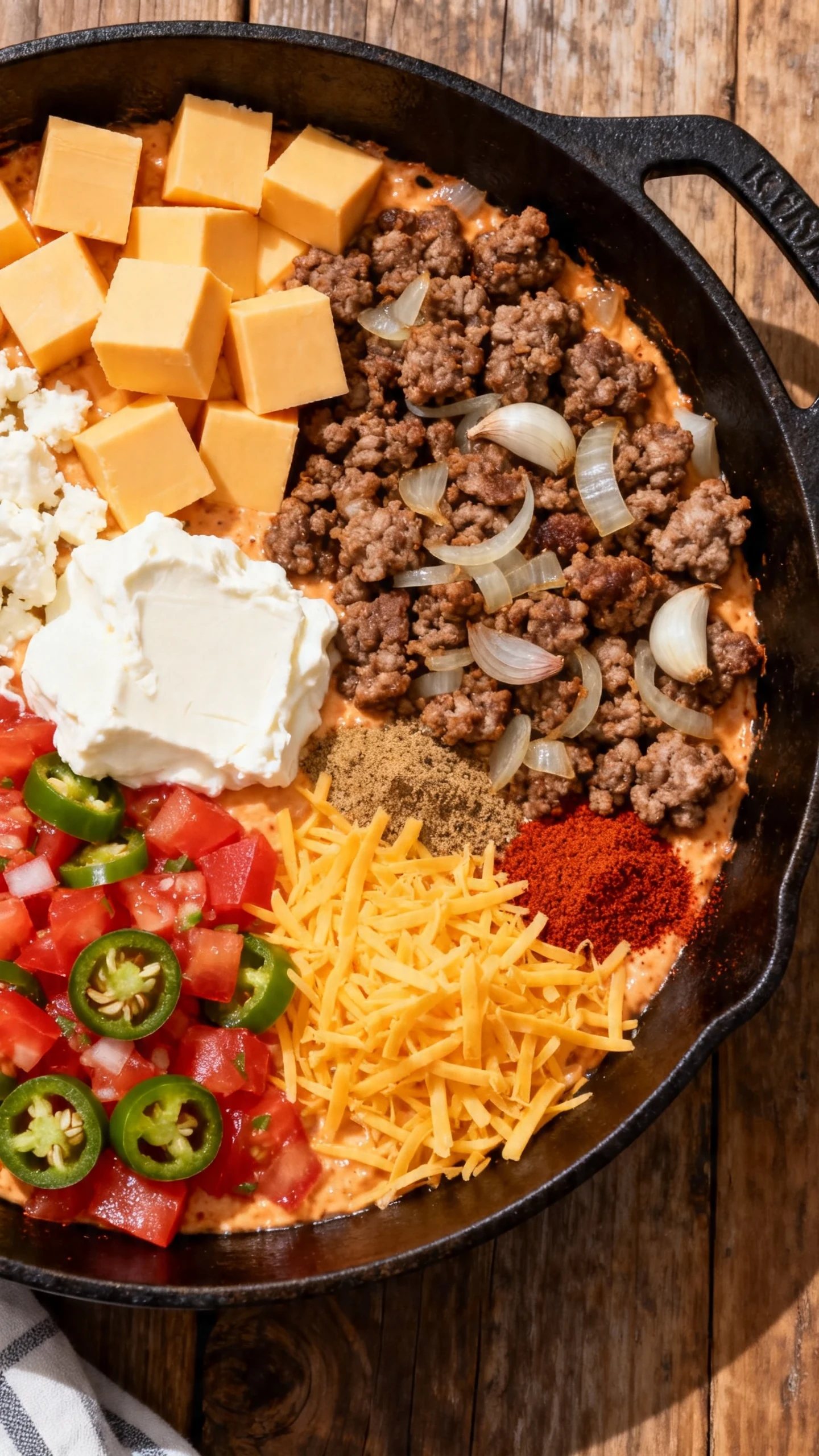 Build the dip base. In a cast iron skillet or disposable foil pan, add the cubed cream cheese, cubed processed cheese, drained tomatoes with green chiles, cheddar, cooked sausage mixture, chili powder, smoked paprika, cumin, black pepper, and jalapeno if using.