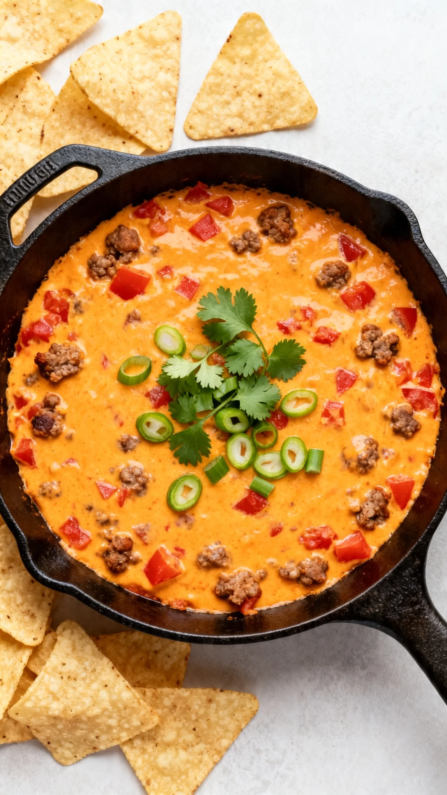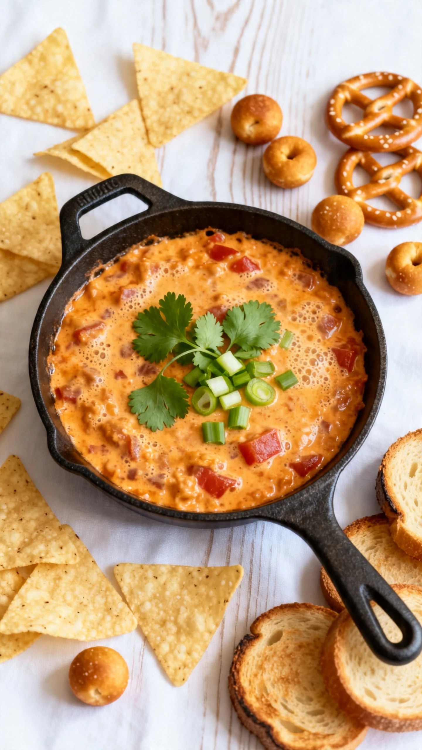 Tortilla chips are the classic choice, but pretzel bites, crackers, celery sticks, toasted baguette slices, and bell pepper strips also work. If you want a stronger chip, choose one that will not snap under pressure. Nobody enjoys excavation work at the bottom of a hot skillet.