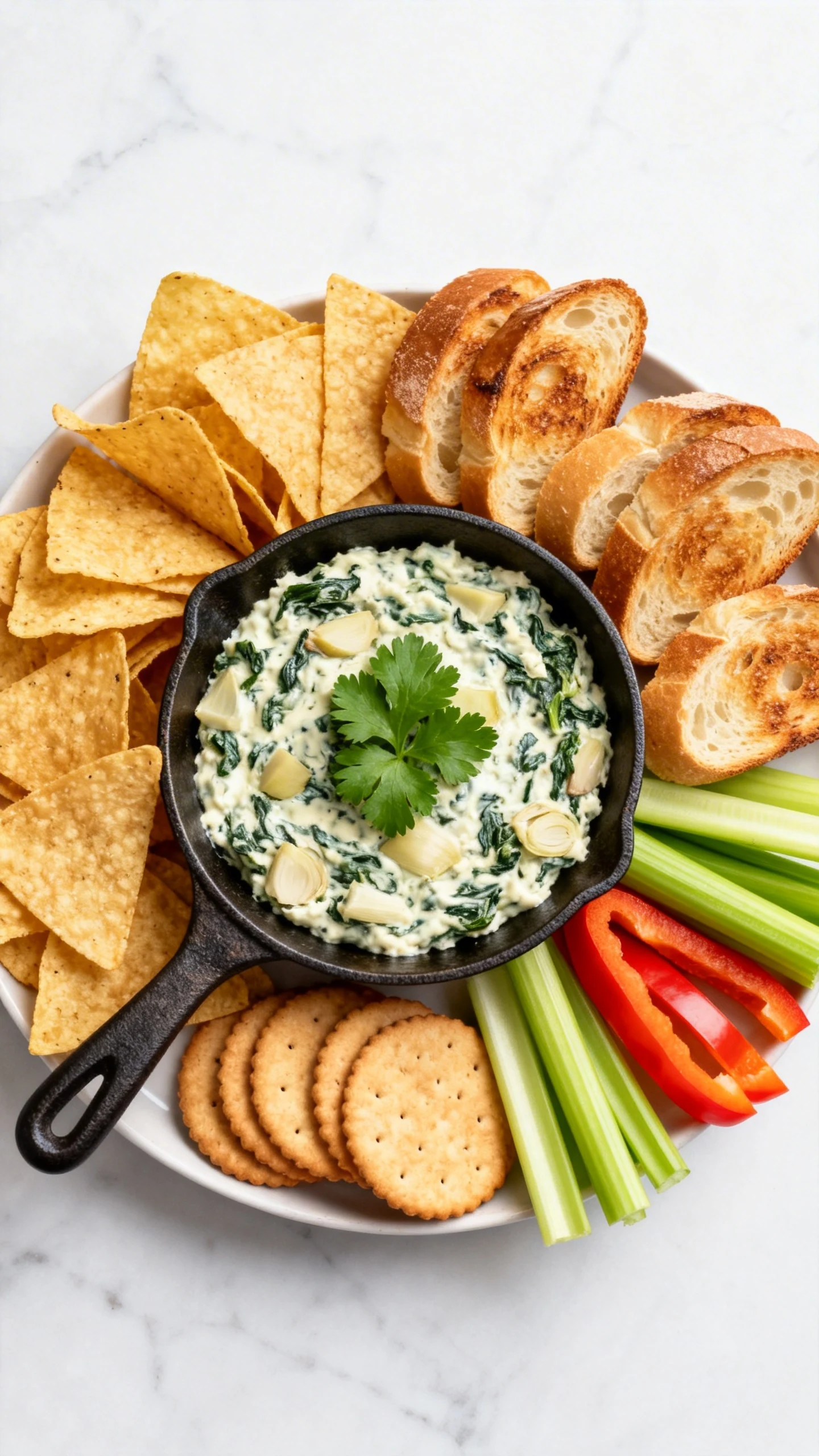 Toasted baguette slices, pita chips, tortilla chips, crackers, pretzel crisps, celery sticks, cucumber rounds, and bell pepper strips all work well. A mix of crunchy and fresh options gives people choices, which they weirdly love.