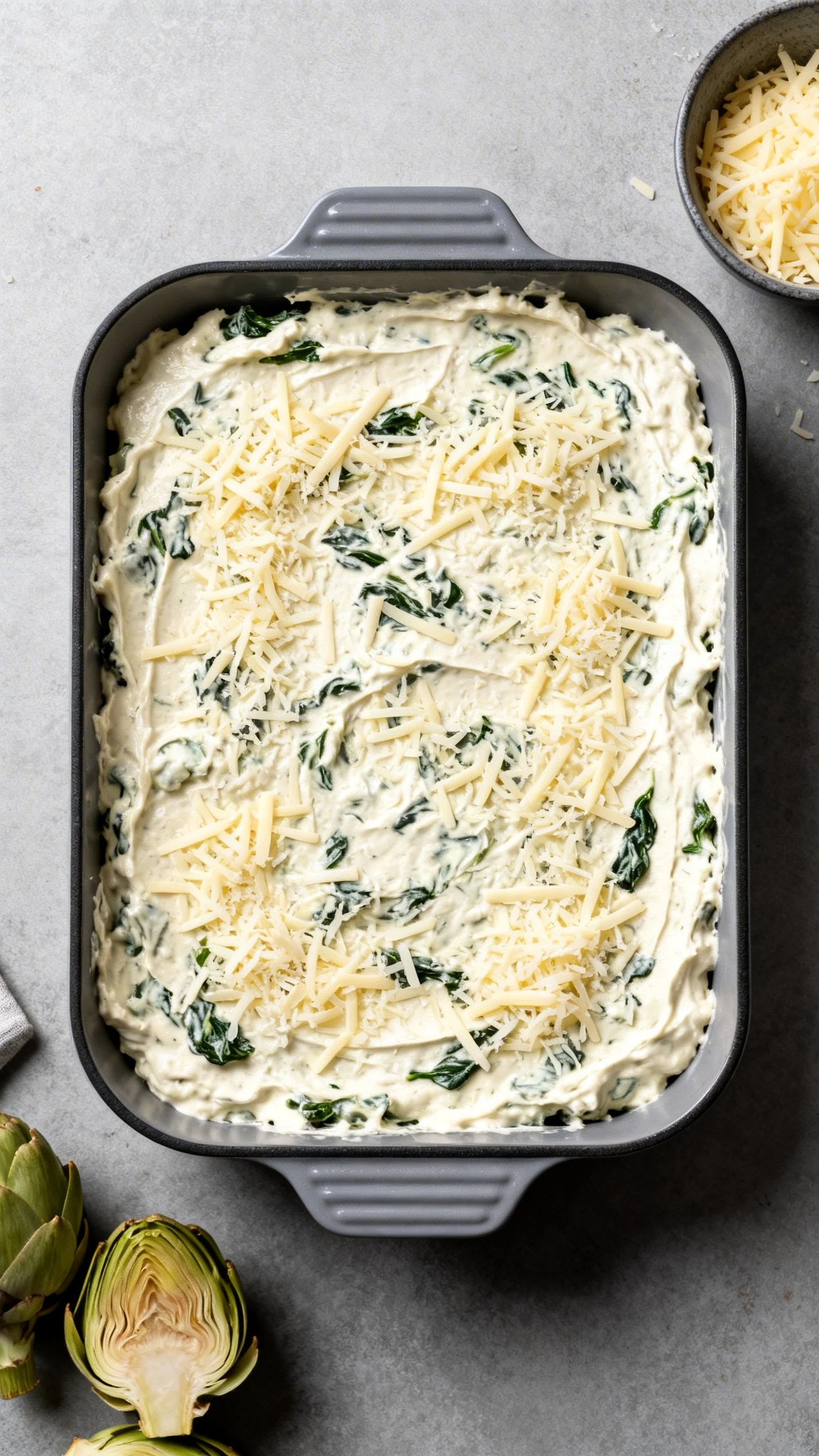 4. Add the good stuff. Fold in the spinach, artichokes, mozzarella, and about 3/4 cup of the Parmesan. Mix until evenly combined. The mixture should look thick and spreadable, not runny.