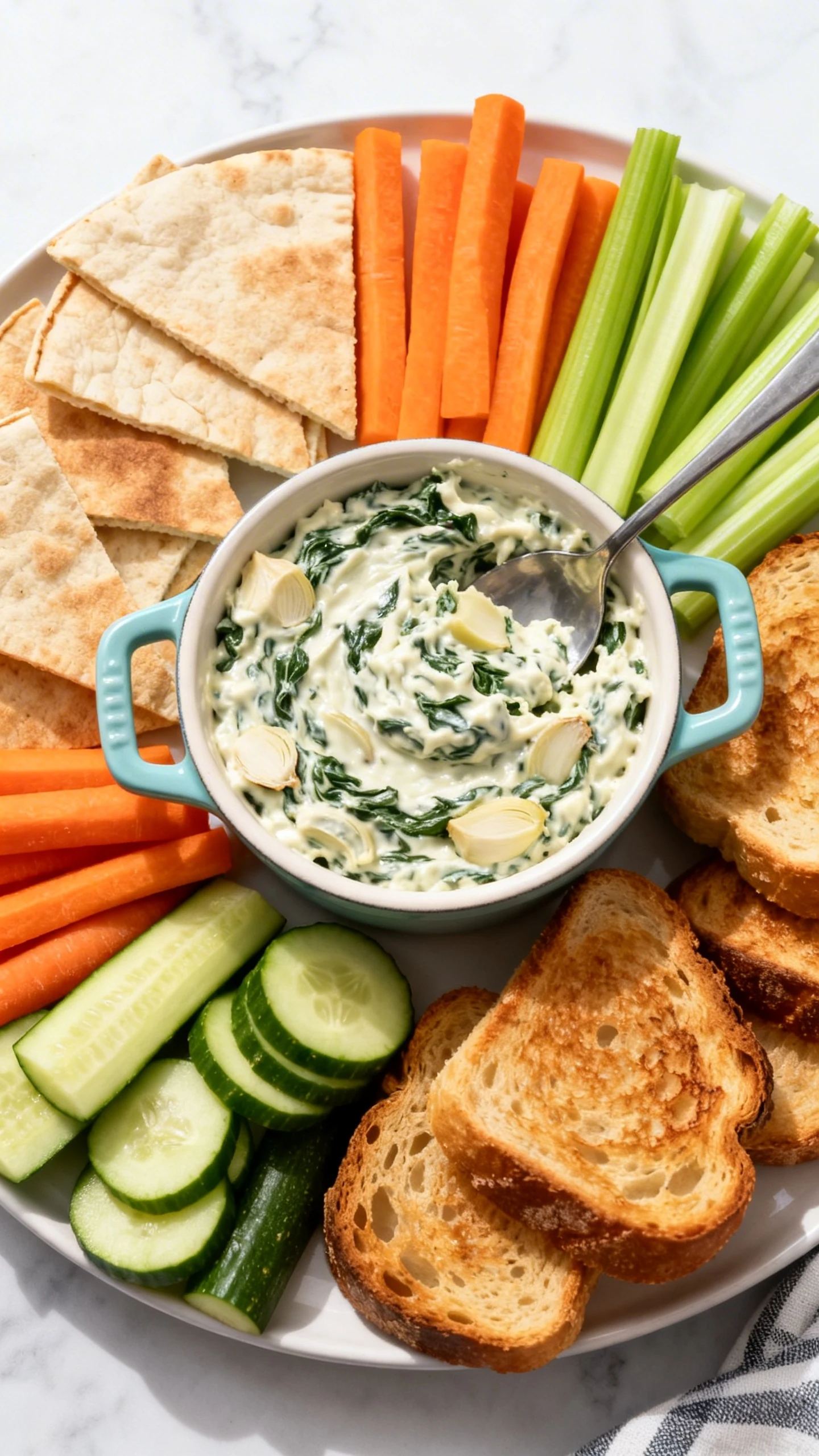 Try toasted baguette slices, crackers, pita wedges, pretzel crisps, celery, carrots, cucumber rounds, or even roasted potato wedges. A sturdy dip deserves a sturdy scoop.