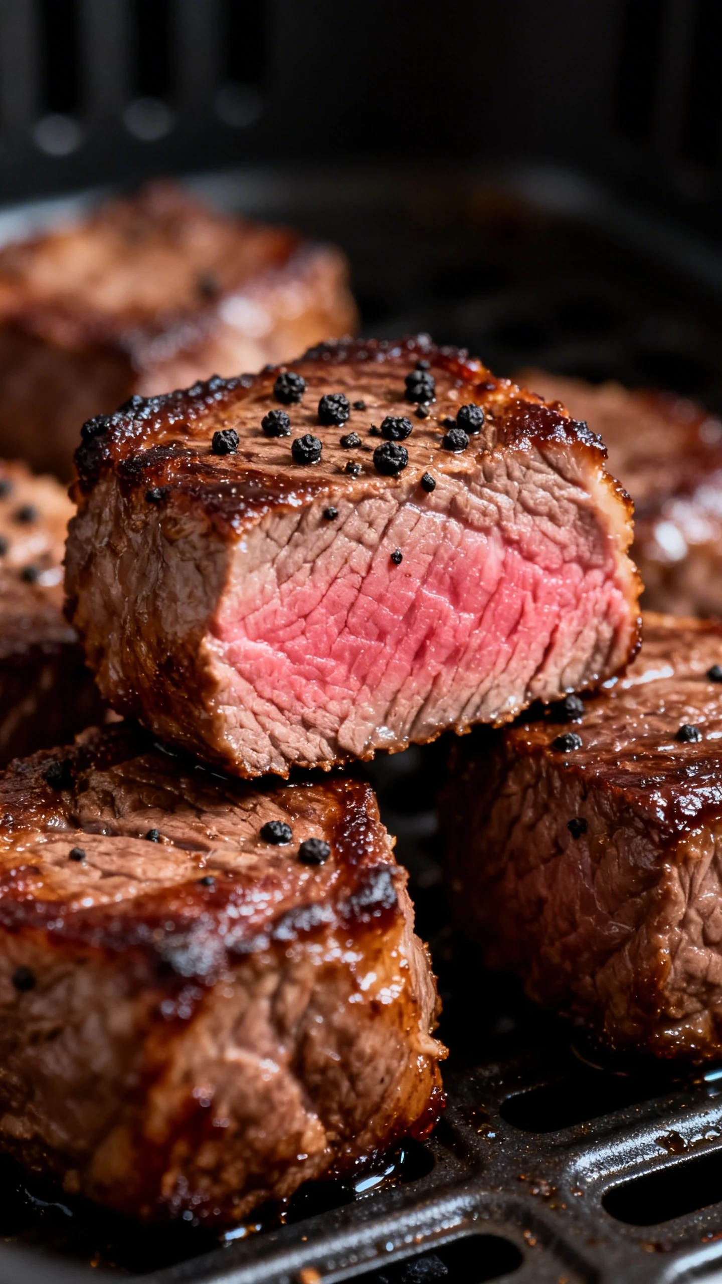 Dial in doneness. For bites: 4 to 5 minutes usually lands medium-rare to medium depending on your air fryer and steak size. For a small whole steak: start at 6 minutes, flip, then 4 to 6 more minutes. Use a thermometer if you want certainty: 125°F rare, 135°F medium-rare, 145°F medium.
